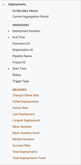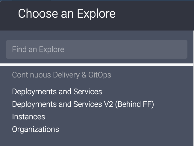 An Explore is a starting point for a query that is designed to explore a particular subject area. This topic describes the various explores available for monitoring CD deployments, and the data the provide. The following image shows the list of explores available for visualizing CD data.