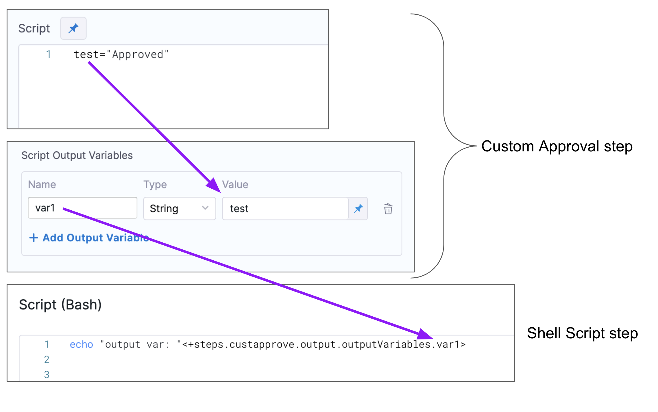 - For example, you set a value for a variable in your script, output that variable from the script, and then use that variable in the approval/rejection criteria of the Custom Approval step.