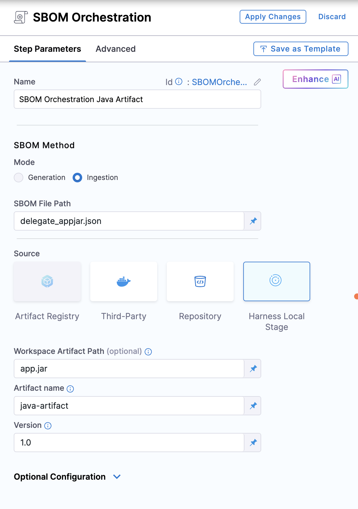 Artifact Source: Select the Harness Local Stage as the source of the artifact.